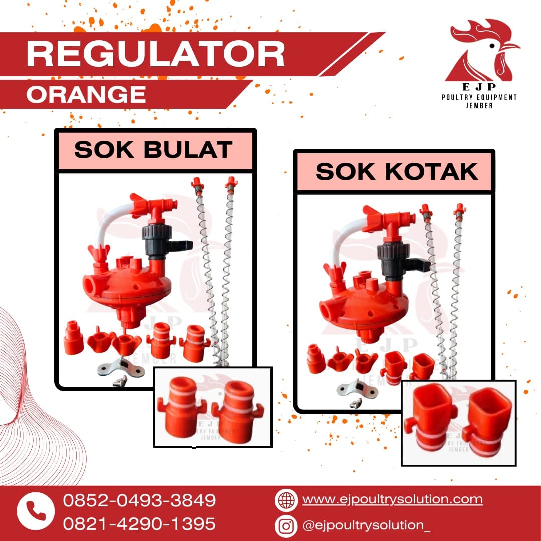 -> Regulator Orange ini memiliki fungsi sebagai kontrol tekanan air di dalam pipa nippel ayam. Tekanan air diatur berdasarkan umur ayam. Dimana ayam kecil membutuhkan tekanan air yang rendah supaya saat mereka mematuk nippel tidak merasa takut saat meminumnya karena tekanan airnya kecil.