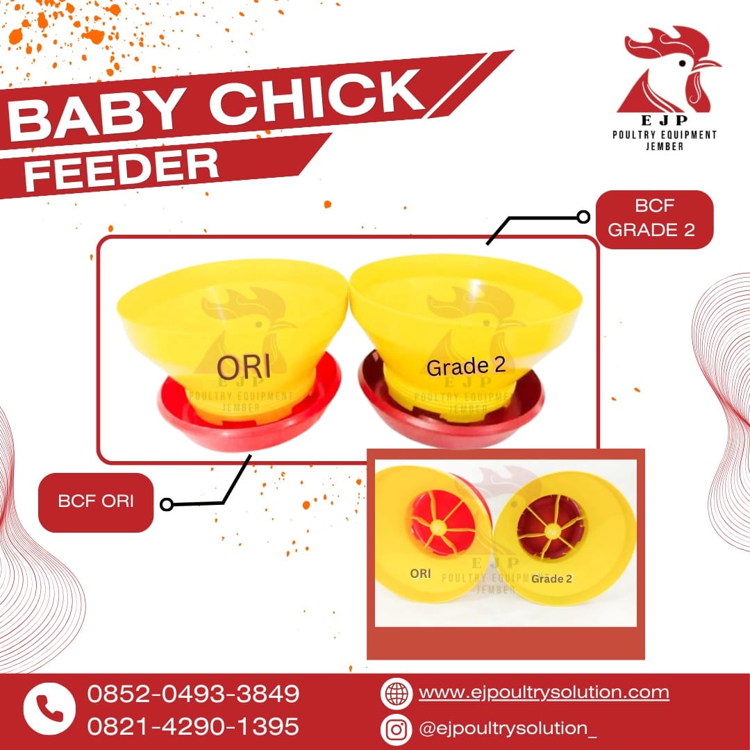 ->Tempat pakan ayam Baby Chick Feeder (BCF) disini dikhususkan untuk ayam doc yang baru masuk kandang dan untuk umur 0 hingga 14 hari. Tempat pakan ayam ini berkapasitas 3kg sehingga cukup jika hanya untuk ayam doc. 1 buah tempat pakan baby chick feeder dapat digunakan untuk 20-25 ekor ayam doc. Baby chick feeder ini dibuat memang diperuntukkan bagi ayam kecil karena ketinggian lepeknya menyesuaikan dengan tinggi dari doc itu sendiri.