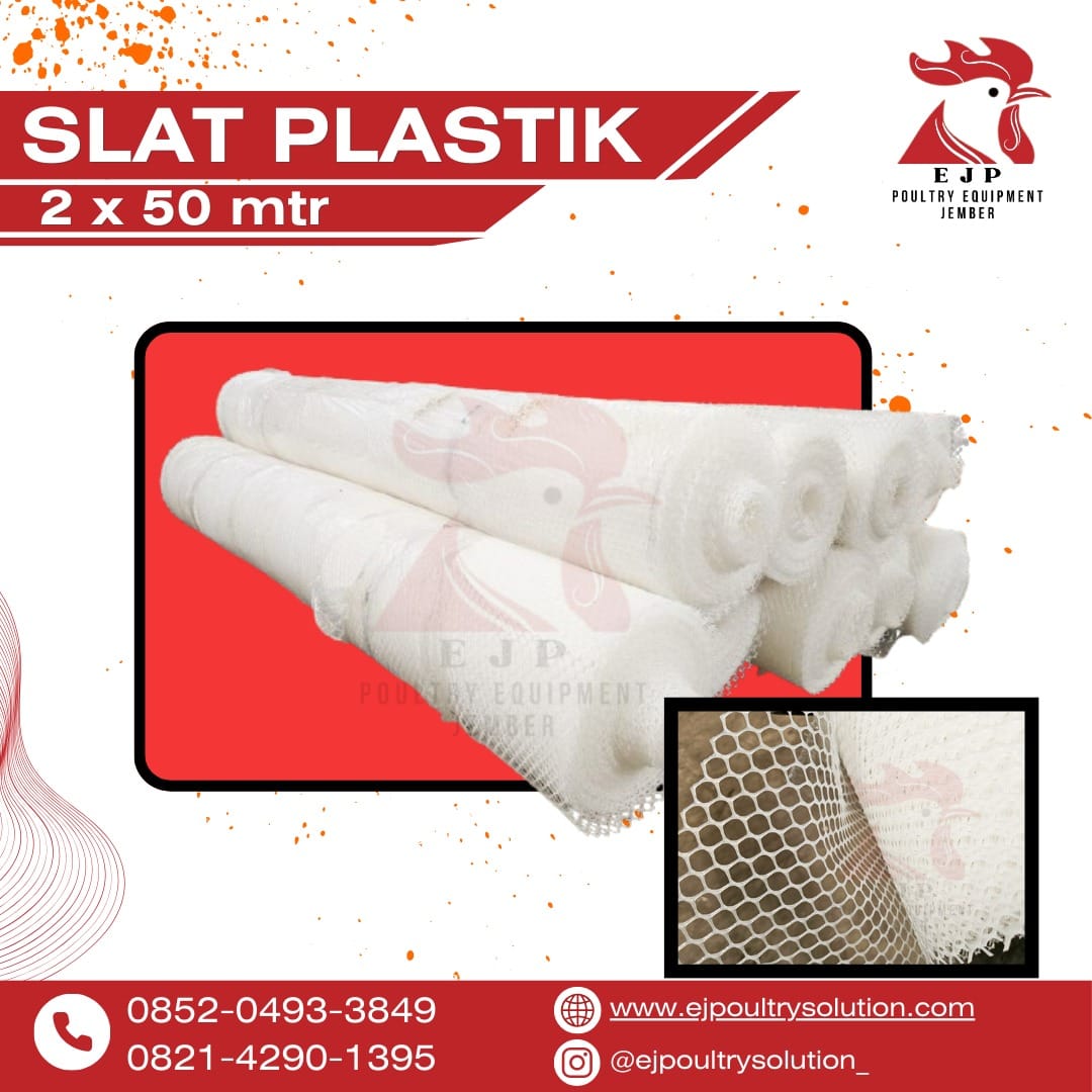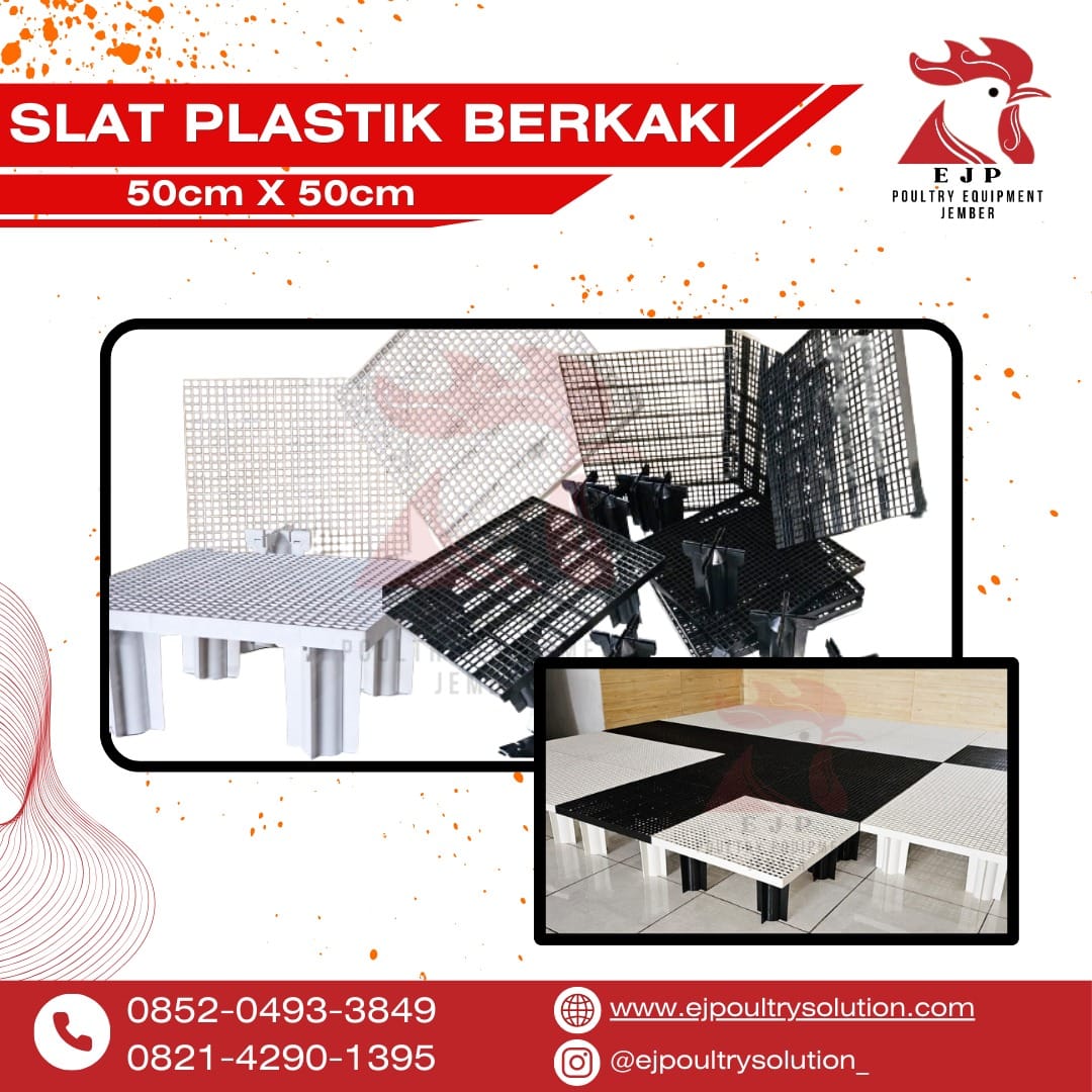 -> Slat floor yang kami tawarkan berwarna hitam, produk ini disebut juga Slat Flooring dikembangkannya slat adalah untuk meningkatkan kualitas ayam broiler yang dihasilkan menjadi lebih baik. Pada pemeliharaan ayam broiler yang dipelihara menggunakan slat akan lebih sehat dan memiliki kualitas karkas lebih baik, karena slat plastik mampu mengurangi kerusakan fisik pada kaki ayam, bahkan pada sayap ayam. Pada produk ini kami menjual ukuran 100 cm x 50 cm (Slat nya), 1 set = 1 papan Slat + 6 Kaki